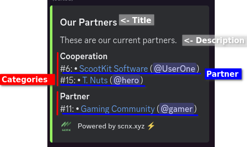 Erstelle eine Liste mit allen Partnern deines Servers - nach Kategorie sortiert.