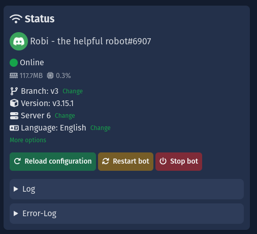 - "Restart bot": This restarts the process of your bot. This might take multiple minutes and involve a high downtime, in which your bot is unreachable. You should only restart your bot if you get asked to do this, are experiencing weird issues or want to apply an update.